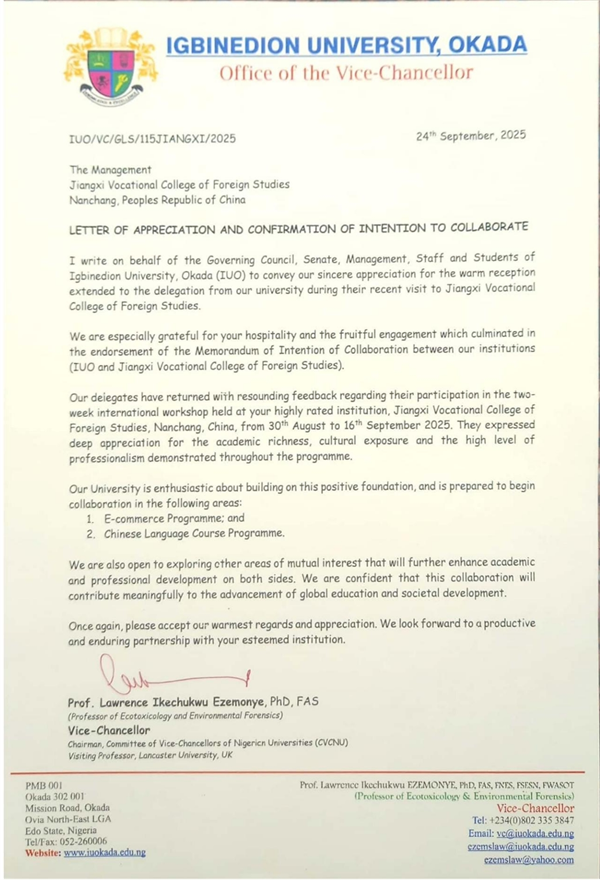 伊格比奈丁大学副校长Lawrence Ikechukwu Ezemonye教授在信中特别提及,伊格比奈丁大学代表团于2025年9月赴江西外语外贸职业学院参加了为期两周的交流活动。活动中,该校精心安排了汉语课程、中国国情、建筑工程技术讲座等学术活动,并组织代表团赴滕王阁、江西省博物馆等地开展国情教育与历史文化实地教学,体验了中国剪纸、功夫、茶文化、城南龙灯及毛笔制作等丰富的非遗活动。代表团对学校的学术水平、文化氛围及专业组织能力给予了充分认可。双方还同步签署了合作意向备忘录,为后续合作筑牢根基。