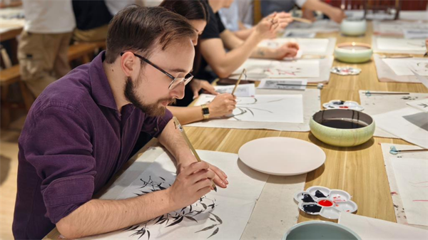 活动以“理论+实践”的形式展开,特邀南昌市传统工艺工作站站长、豫章木煅柴烧代表性传承人李建现场讲解江西瓷文化的发展脉络以及南昌瓷板画的历史渊源,结合中文日主题分享瓷板画中的江西元素及其文化寓意。江西师范大学美术学院王燕教授介绍了中国国画的青绿山水和文人墨色,还现场展示了国画技法——泼墨。从景德镇青花瓷的千年传承到现代瓷艺的创新表达,外籍人士通过视频影像、实物展品与手绘演示,深入了解了釉下彩青花瓷的设计打稿、勾画笔法、勾线填色等工艺流程。