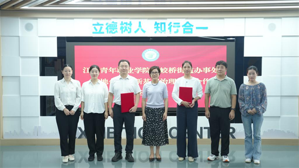 10月15日,江西青年职业学院与南昌市经济技术开发区蛟桥街道办事处举行校地合作签约仪式。蛟桥街道党工委书记邓飞及办事处相关负责同志,学校党委委员、副院长刘英,党委委员、教务处处长戴彩云及校企合作办、青少年教育系等相关负责人参加仪式。