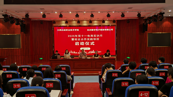 近日,江西冶金职业技术学院商务管理学院的“2025年双十一电商实训月暨校企合作实践项目”启动仪式在图书馆报告大厅举行。商务管理学院院长郭斌,副院长江小美、陈利华,杭州聚学电子商务有限公司校企部总监侯丽玲,客服业务主管白小戈出席仪式,200余名参训师生参加仪式。