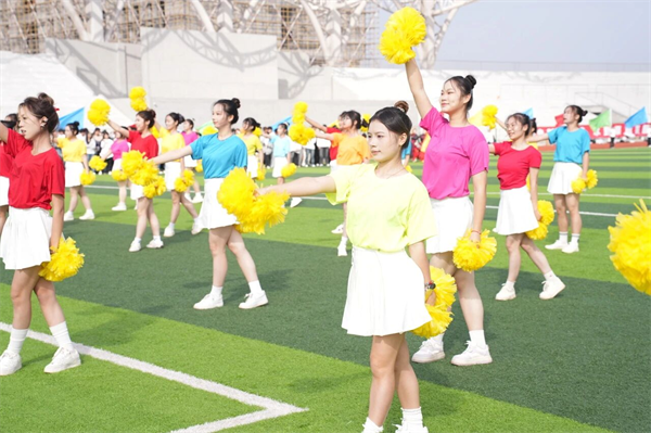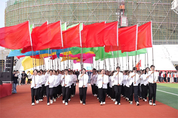 “青春・集结”篇章以庄重仪式拉开序幕。国旗队、会旗队迈着铿锵步伐率先入场,各系运动员方阵与裁判员队伍依次跟进——不少方阵手持契合专业特色的道具,变换创意队形传递青春巧思。“青春无畏,逐梦扬威”“团结拼搏,超越自我”此起彼伏的嘹亮口号响彻运动场,青院学子积极向上、团结奋进的精神风貌跃然眼前。
