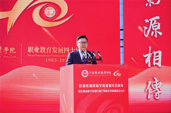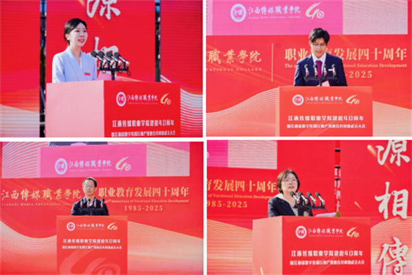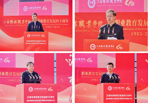 豫章师范学院党委委员、副校长曾振华,上海市政协委员、上海新闻出版职业技术学校党委书记、校长、上海新闻出版教育培训中心主任黄彬作为兄弟院校代表致辞,肯定了江西传媒职业学院的办学成就,并期待今后在人才培养、资源共享、科研协同等方面深化校际合作。