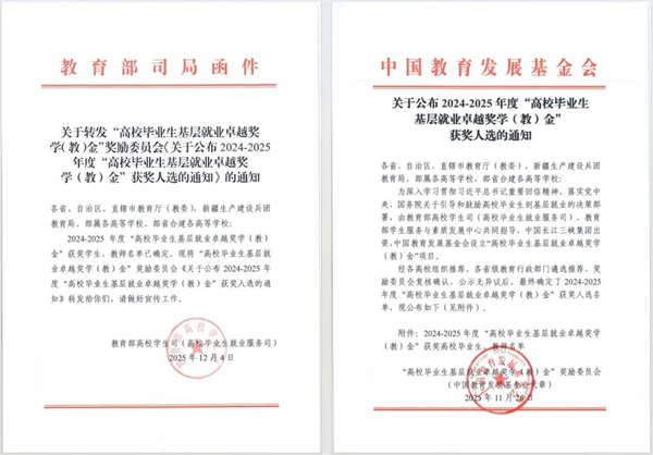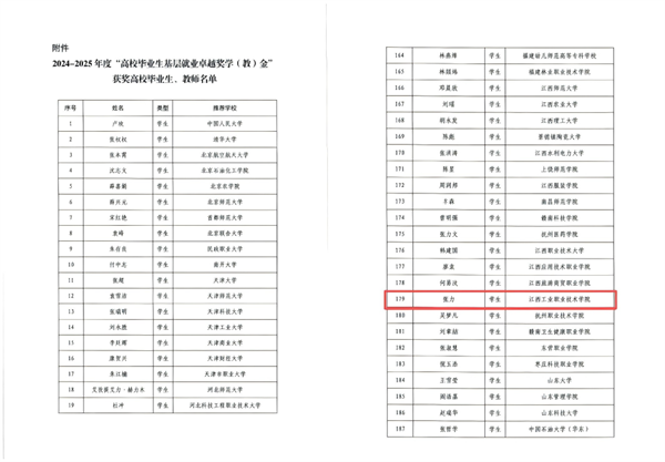 近日,教育部发文公布2024-2025年度“高校毕业生基层就业卓越奖学金”获奖人员名单,江西工业职业技术学院选送的2020届校友张力获此殊荣。该奖项由教育部高校学生司(高校毕业生就业服务司)、教育部学生服务与素质发展中心共同指导,由中国教育发展基金会特设,旨在贯彻落实党中央、国务院关于引导和鼓励高校毕业生到基层就业的决策部署,奖励赴基层就业并做出突出业绩的普通高校毕业生,本年度全国高校仅评选出418人。