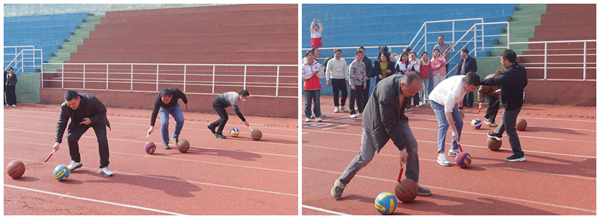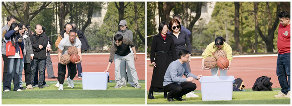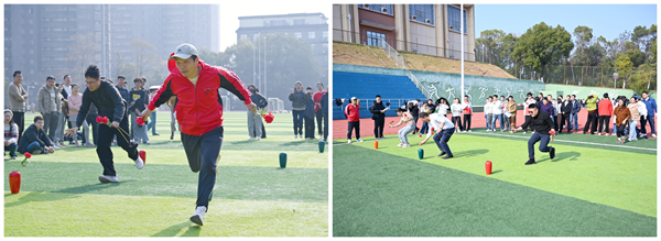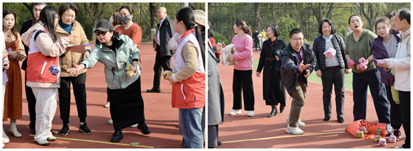 各项趣味项目各具特色、妙趣横生。本届教职工趣味运动会共分10支代表队,578名教职工们参加了“瞎子敲锣”“公鸡下蛋”“插花接力”“不倒森林”“纸衣往返接力”“赶‘猪’跑接力”“拾球接力赛”“丢沙包比赛”“抱球接力”9个比赛项目的角逐。各项目均设置专业裁判与工作人员,严格按照竞赛规程计时计分,确保比赛公平公正。