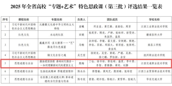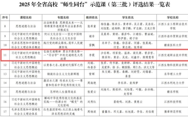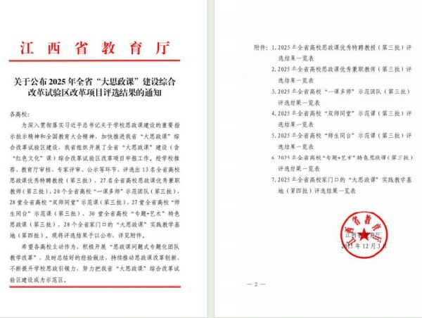 近日,江西省教育厅公布了2025年全省“大思政课”建设综合改革试验区改革项目评选结果。江西交通职业技术学院凭借扎实的教学改革与创新实践,2项成果入选省级项目名单。其中,由思政课教师李霞负责申报的《弘扬交通精神 勇当开路先锋——“寻访学”中的交通特色大思政课》荣获全省“师生同台”示范课(第三批);由思政课教师殷梅负责申报的《激扬爱国热情 奏响时代强音——如何理解新时代的爱国主义》荣获全省“专题+艺术”特色思政课(第三批)。