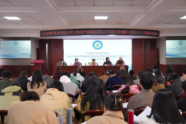 为深入贯彻省教育厅、省人力资源和社会保障厅、省工业和信息化厅联合印发的《关于推动产教融合校企合作的十条举措(试行)》文件精神,全面深化产教融合、校企合作,1月6日下午,江西青年职业学院在行政楼三楼多功能厅召开专题学习会议。党委班子成员、相关职能部门、各系负责人,及教研室主任、专业负责人参会,会议由党委委员、副院长刘英主持。