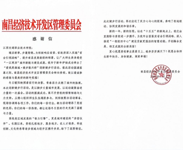 活动结束后,南昌经开区管委会向学院发来感谢信,对学院精心组织师生参与“健步行”活动致以诚挚感谢,对政校双方在人才培养、科技创新、文化传承等领域的联动发展表示深切期待。