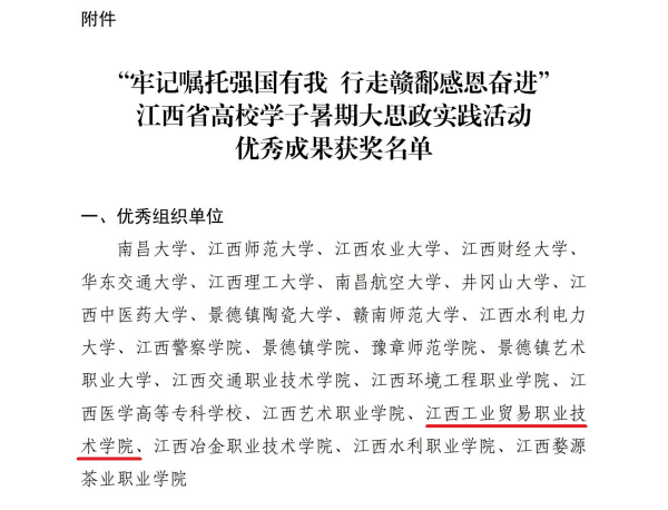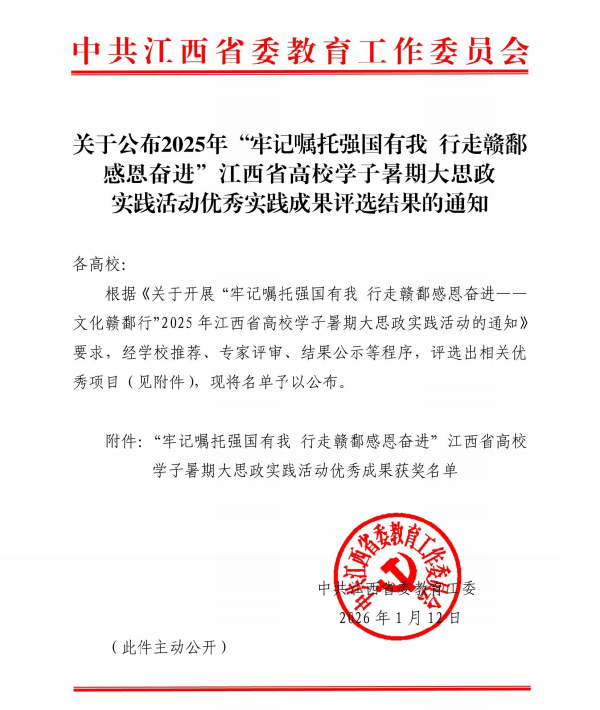 近日,中共江西省委教育工委公布了“牢记嘱托强国有我 行走赣鄱感恩奋进”江西省高校学子暑期大思政实践活动优秀成果评选结果。