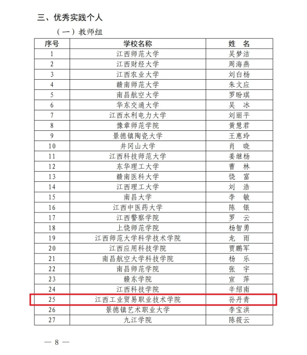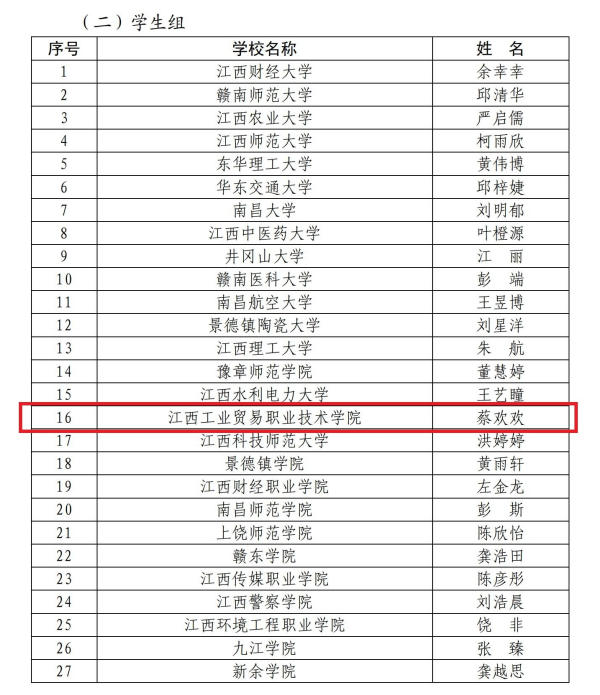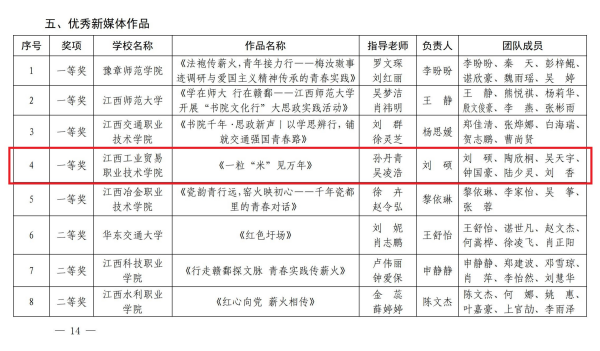 江西工业贸易职业技术学院获评“优秀组织单位”,机电工程系“光明”实践团获评“优秀实践团队”,学院孙丹青荣获教师组“优秀实践个人”称号,经济贸易系蔡欢欢荣获学生组“优秀实践个人”称号,党委宣传部、粮油•建艺系选送的《一粒“米”见万年》获优秀新媒体作品一等奖,党委宣传部、粮油•建艺系选送的《“洞见万年”系列文创设计》获优秀文创作品一等奖。