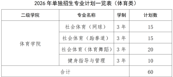 体育类招生计划60人。考试科目:文化全省统考+职业技能测试(体育类)。