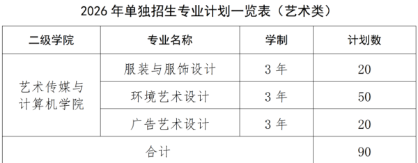 艺术类招生计划 90人。考试科目:文化全省统考+职业技能测试(艺术类)。