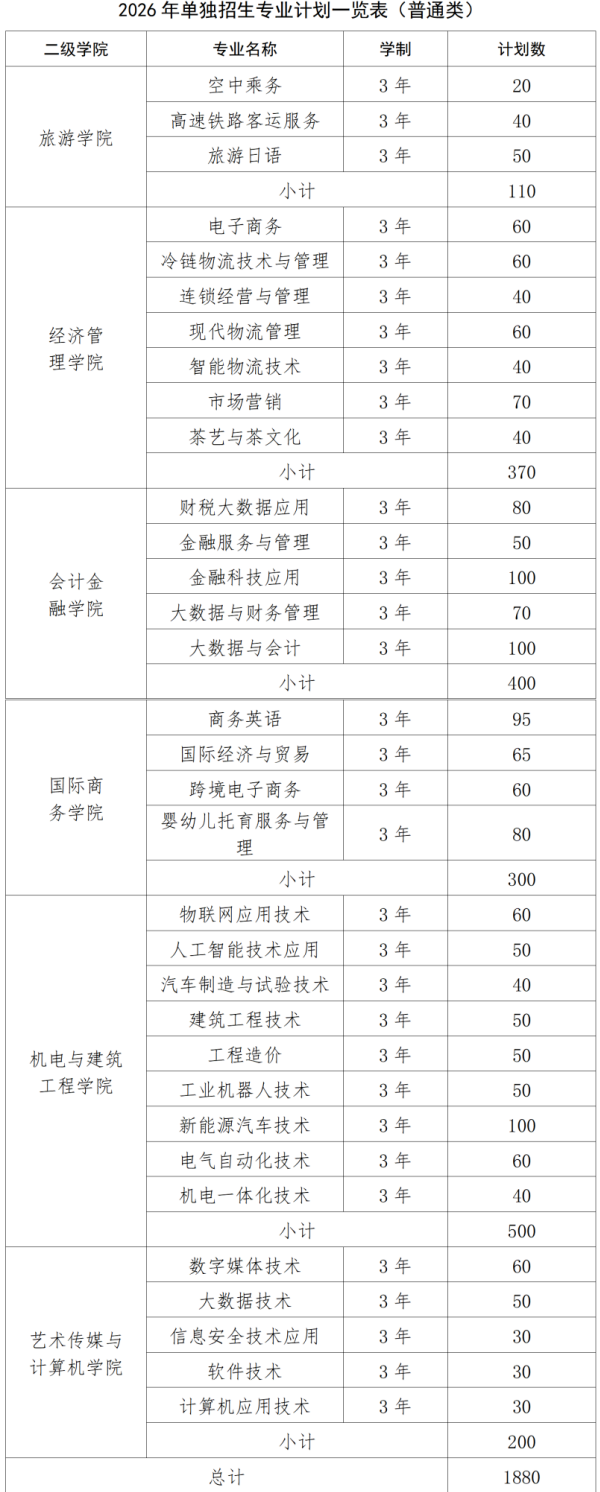 2026年单独招生计划共2450人(其中普通类1880人、艺术类90人、体育类60人、旅游类320人,与萍乡市工业中等专业学校联合培养100人)。