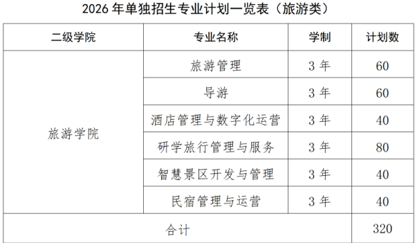 旅游类招生计划共计320人。考试科目:文化全省统考+职业技能测试(旅游类)。