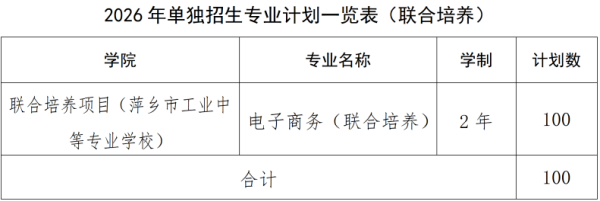 联合培养项目招生计划100人,只招收与招生专业相同或相近专业(同一专业大类)的中等职业学校(含技工学校、职业高中)应届毕业生,培养地点设在萍乡市工业中等专业学校。考试科目:文化全省统考+职业适应能力测试。