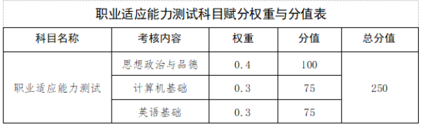 (1)职业适应能力测试:主要以中学(普高、职高、技校、中专)所学知识为基础,考察学生的思想道德素质,计算机应用基础、英语基础知识等内容,考评方式为笔试。普通类、联合培养类采用职业适应能力测试。