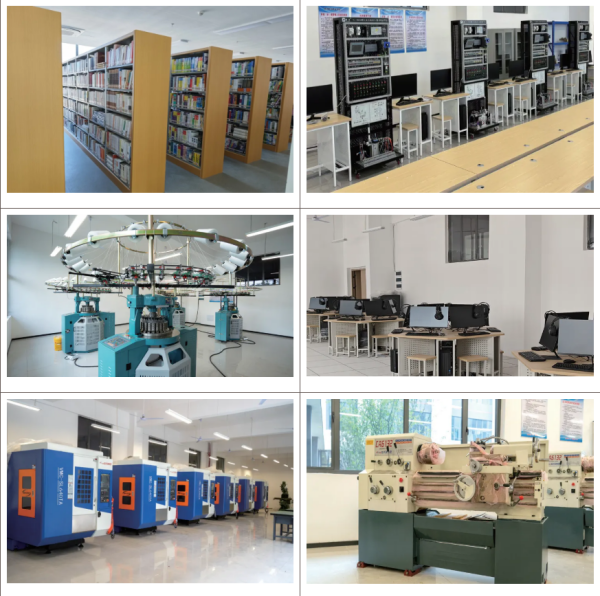 校内实训基地分三大专区:智能制造实训专区含电子电工综合、工业机器人、工业自动化、液压与气动等实训室;纺织服装实训专区设电脑横机、面料分析、服装设计、针织横机、纺织面料检测五大功能室,覆盖从设计、加工到检测全流程实训;公共实训专区配多间语音机房,满足各专业语言教学、计算机基础实训等公共教学需要。
