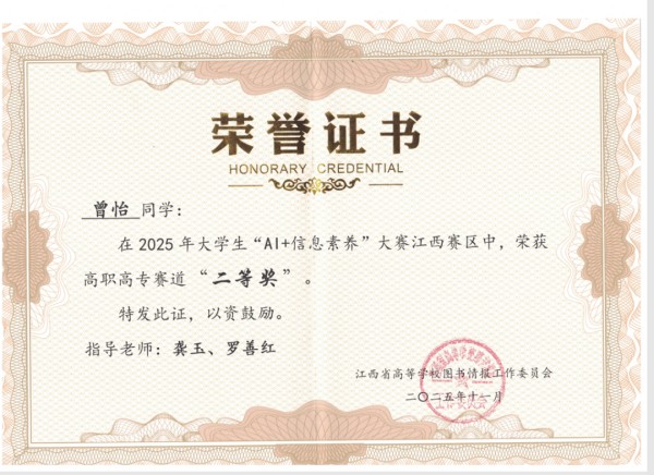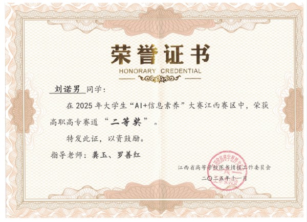 2025 年大学生“AI + 信息素养”大赛(高职高专赛道)省级决赛传来振奋捷报。作为今年刚完成首次招生的新兴高职院校,学校以“实践赋能、素养立身”为育人核心,全力支持全新生组成的参赛队伍奋勇拼搏,最终从全省几十所高职院校的参赛队伍中突出重围,斩获省级二等奖 1 项、优胜奖 1 项,一举拿下学校建校以来首个省级赛事荣誉。