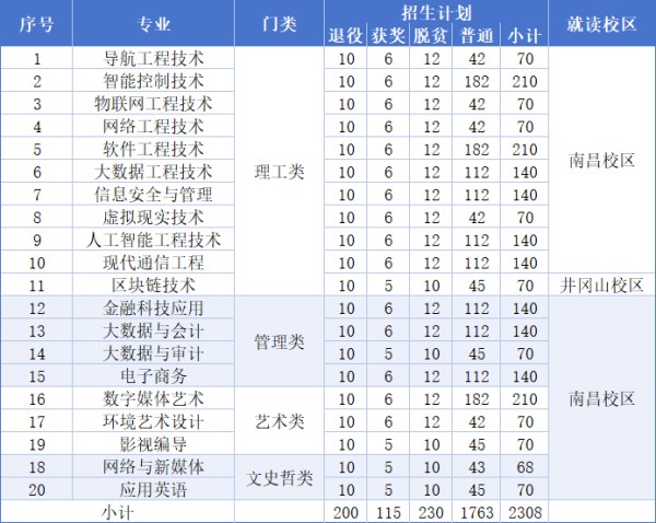 6.专项计划学生录取实行计划单列政策。退役大学生士兵录取工作按照江西省教育厅相关文件要求和学校退役大学生士兵专升本免试录取考察实施方案执行。