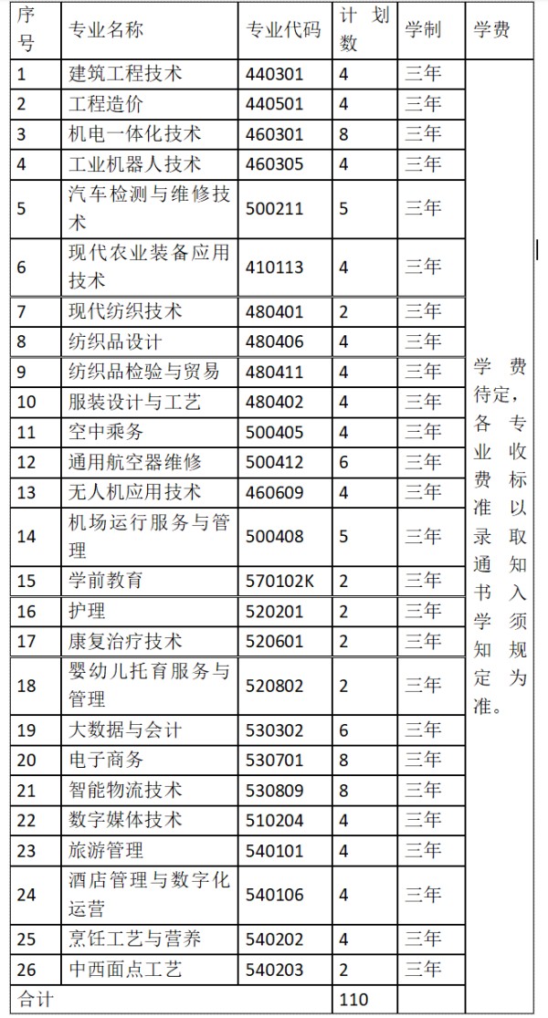 第九条 2026年江西省单招计划数为110人,具体分专业计划如下表: