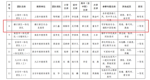 近日,江西省首届大中小学思政课(红色文化)一体化教学展示活动评选结果公布。由赣江新区社会发展局选送,江西机电职业技术学院牵头,联合新区中小学教师组建的“赣江新区一体化教学团队”,以专题教学“守护粮食安全,端稳中国饭碗”在激烈角逐中脱颖而出,荣获一等奖。