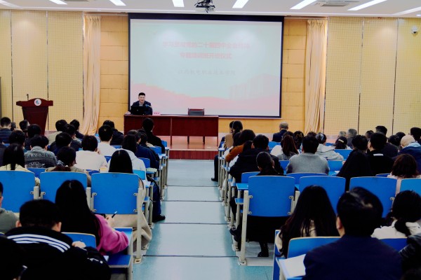 3月25日下午,江西机电职业技术学院在下罗校区举办学习贯彻党的二十届四中全会精神读书班开班式,校党委书记季强出席并作动员讲话。在家校领导、全体中层干部、党员教师代表、民主党派成员和无党派人士代表等200余人参加。