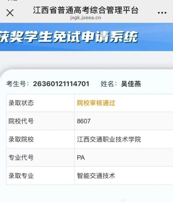 凭借优异的学业成绩与突出的竞赛表现,吴佳燕成功通过江西省高职单招免试录取,被江西交通职业技术学院智能交通技术专业录取。