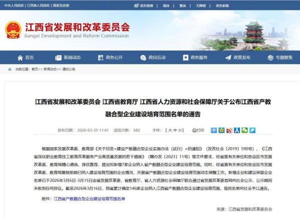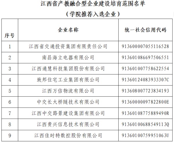 近日,江西省发展和改革委员会、江西省教育厅、江西省人力资源和社会保障厅联合发布了《关于公布江西省产教融合型企业建设培育范围名单的通告》,经江西交通职业技术学院推荐的9家合作企业入选其中,数量位居全省高职院校前列,充分彰显了学院在深化产教融合、推进校企合作、赋能优质合作企业方面的显著成效与示范引领作用。