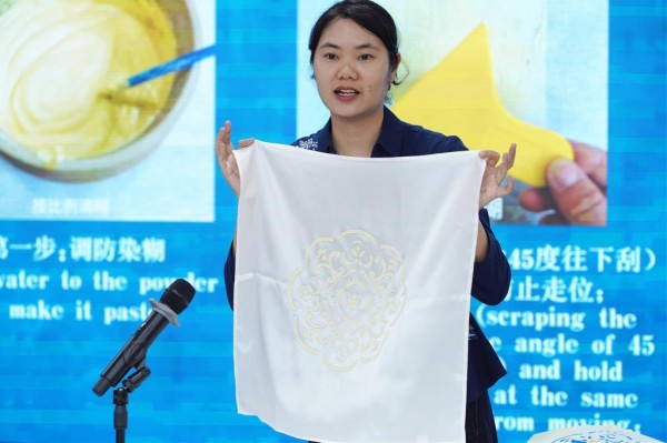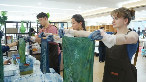“看起来简单,其实是门精细活。”来自英国的高忠义完成作品后感慨道,他举起双手展示染上的靛蓝色印记,“这不仅是技艺,更是人与自然的对话。手上这些蓝,是今天最美的文化印记。”