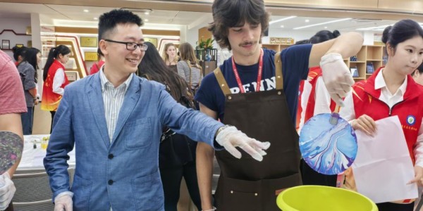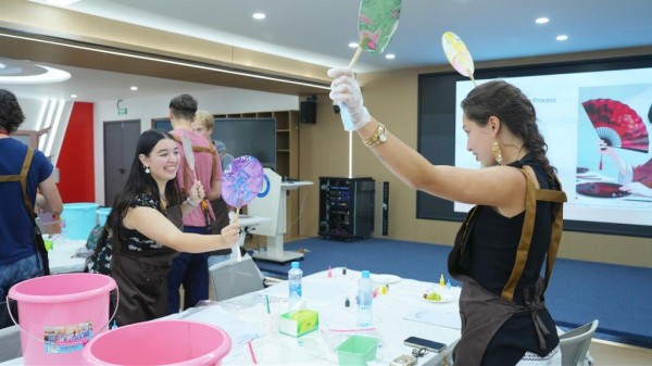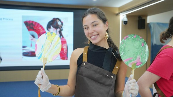 在漂漆漆扇制作环节,学校美育教师徐江昊以简洁生动的语言讲解漆扇的历史渊源与美学内涵。留学生们在指导下滴漆入水、引纹成画,随着扇面入水、提转、定格,一幅幅流动的、不可复制的漆扇作品逐一呈现,现场惊叹与笑语交织,文化在指尖与水面之间悄然传递。