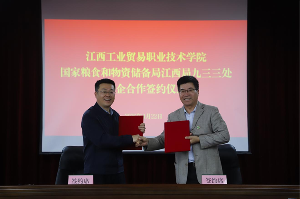 4月22日,江西工业贸易职业技术学院党委副书记、校长朱迎强带队,党委委员、副校长曾聪及相关部门负责人、博士专家团队,赴国家粮食和物资储备局江西局九三三处开展专题调研并签署校企合作协议。九三三处党委书记苏伟,党委委员、纪委书记李臣及相关处室负责人陪同调研并参加签约仪式。