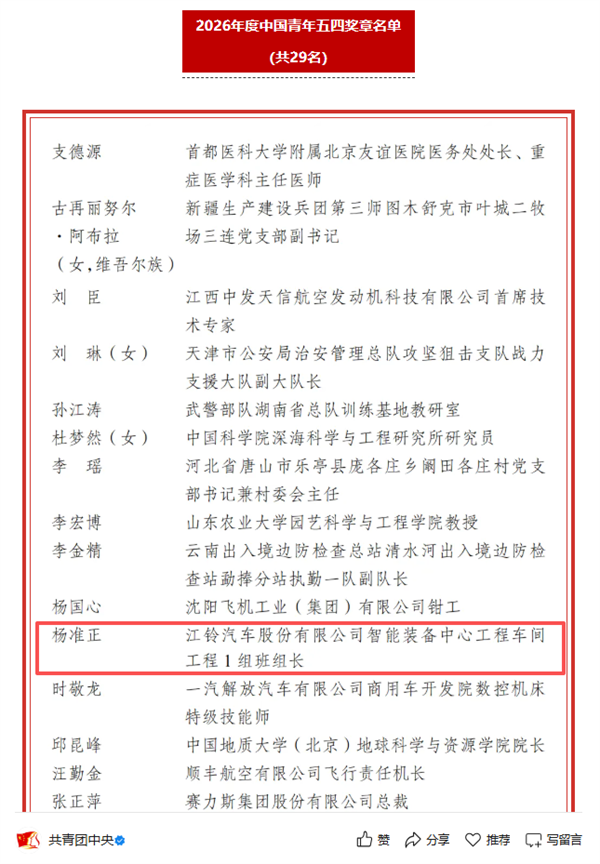 近日,《共青团中央 全国青联关于颁授2026年度中国青年五四奖章暨新时代青年先锋奖的决定》发布。学院2015级机电技术应用班校友、全国劳动模范、江铃汽车股份有限公司智能装备中心工程车间班组长杨准正,凭借卓越的技能素养和突出的岗位贡献荣获2026年度中国青年五四奖章,全国仅29人获此殊荣。