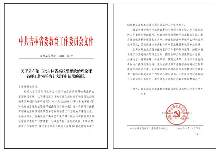 8月18日,中共吉林省委教育工委下发《关于公布第二批吉林省高校思想政治理论课名师工作室培育计划评审结果的通知》,我院姜威教授为第二批吉林省高校思想政治理论课名师工作室主持人,东北师范大学、吉林大学等十所高校思政课教师获批。