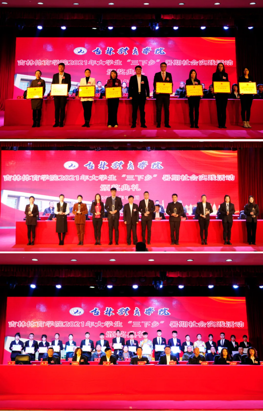 为表彰先进,弘扬典型,激励和引领吉林体育学院青年学生积极投身社会实践活动,大会对2021年学校“三下乡”社会活动先进个人和集体进行了表彰。校长邵桂华、党委副书记尹忠分别为“优秀组织单位”和“优秀指导教师”颁奖,与会领导为“先进个人”颁发了证书。