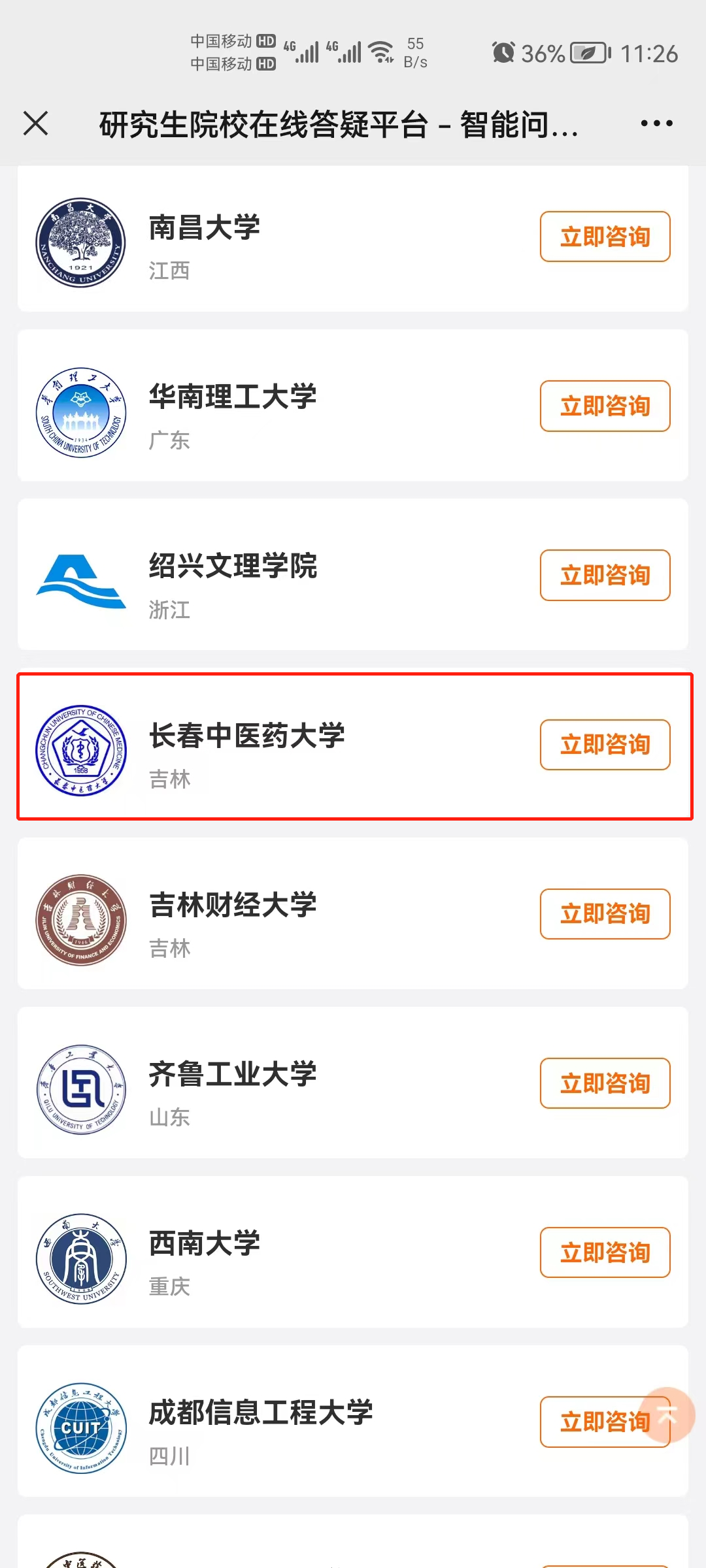 中国教育在线掌上考研APP页面中搜索“长春中医药大学”,进入详情页之后点击“问招办”模块,即可在线咨询。