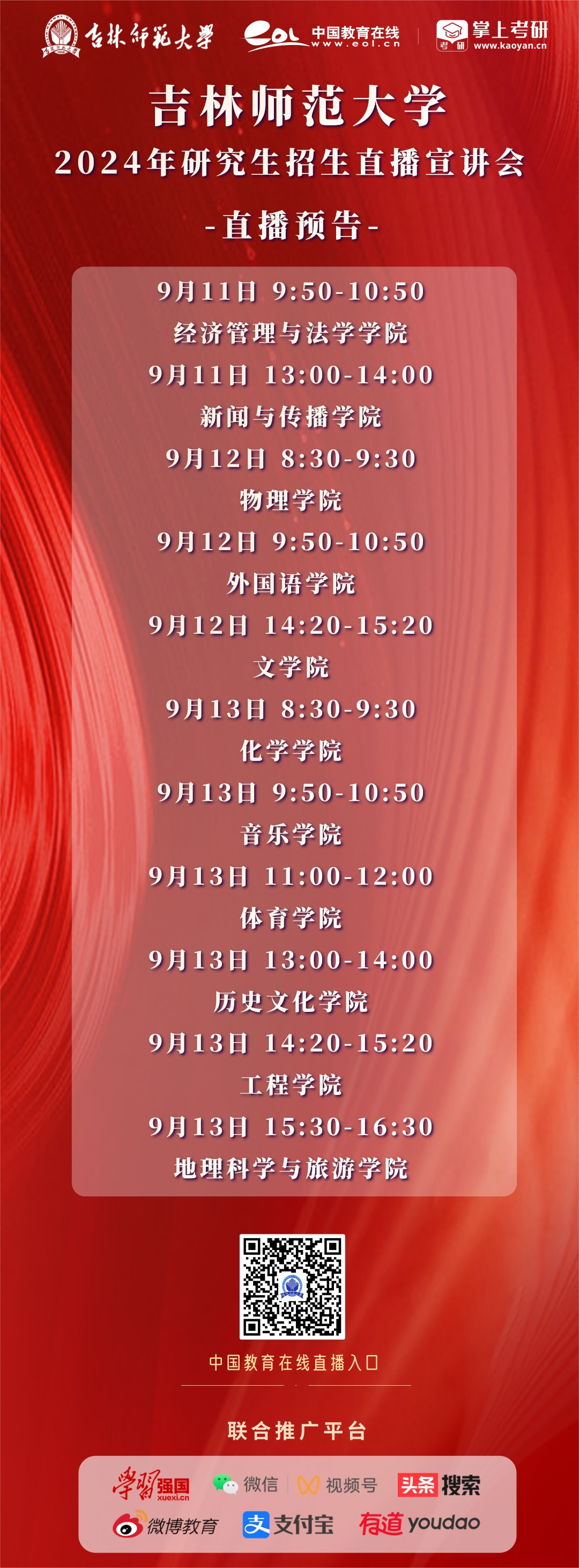 为提升各地考生对吉林师范大学研究生招生政策及培养特色的了解,扩大吉林师范大学的影响力,选拔更多优秀学子攻读吉林师范大学研究生,9月11日-13日,吉林师范大学研究生院邀请多位教授、导师,做客中国教育在线·掌上考研直播间,与广大考生云端相聚、共话考研。