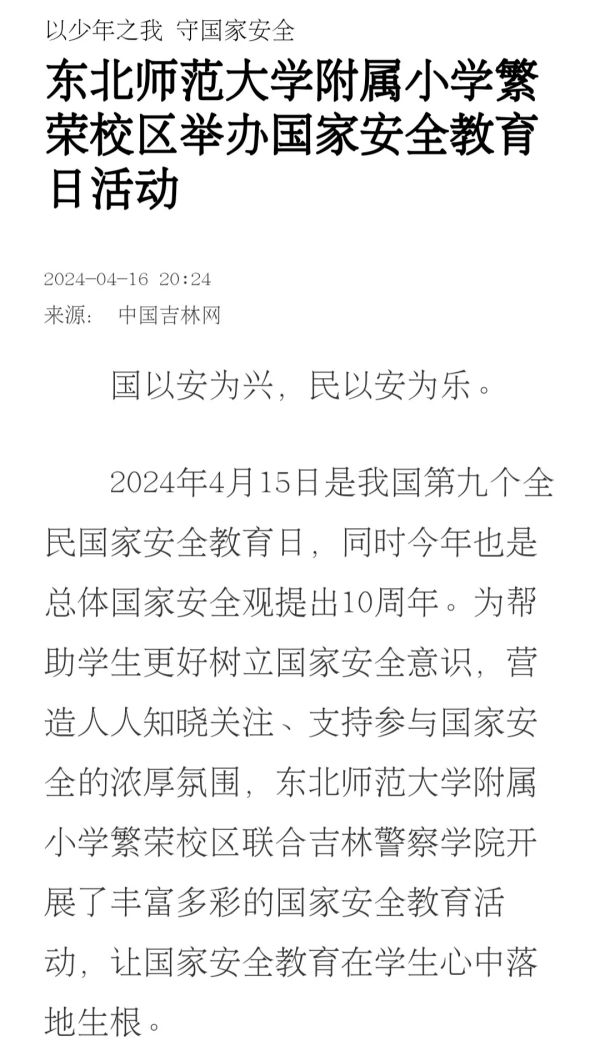 4月15日和17日吉林警察学院侦查系国家安全教育宣讲团组织21名青年大学生志愿者先后分两批次赴东北师范大学附属小学繁荣校区,开展总体国家安全观“大手牵小手”教育活动,为小学生普及国家安全知识。