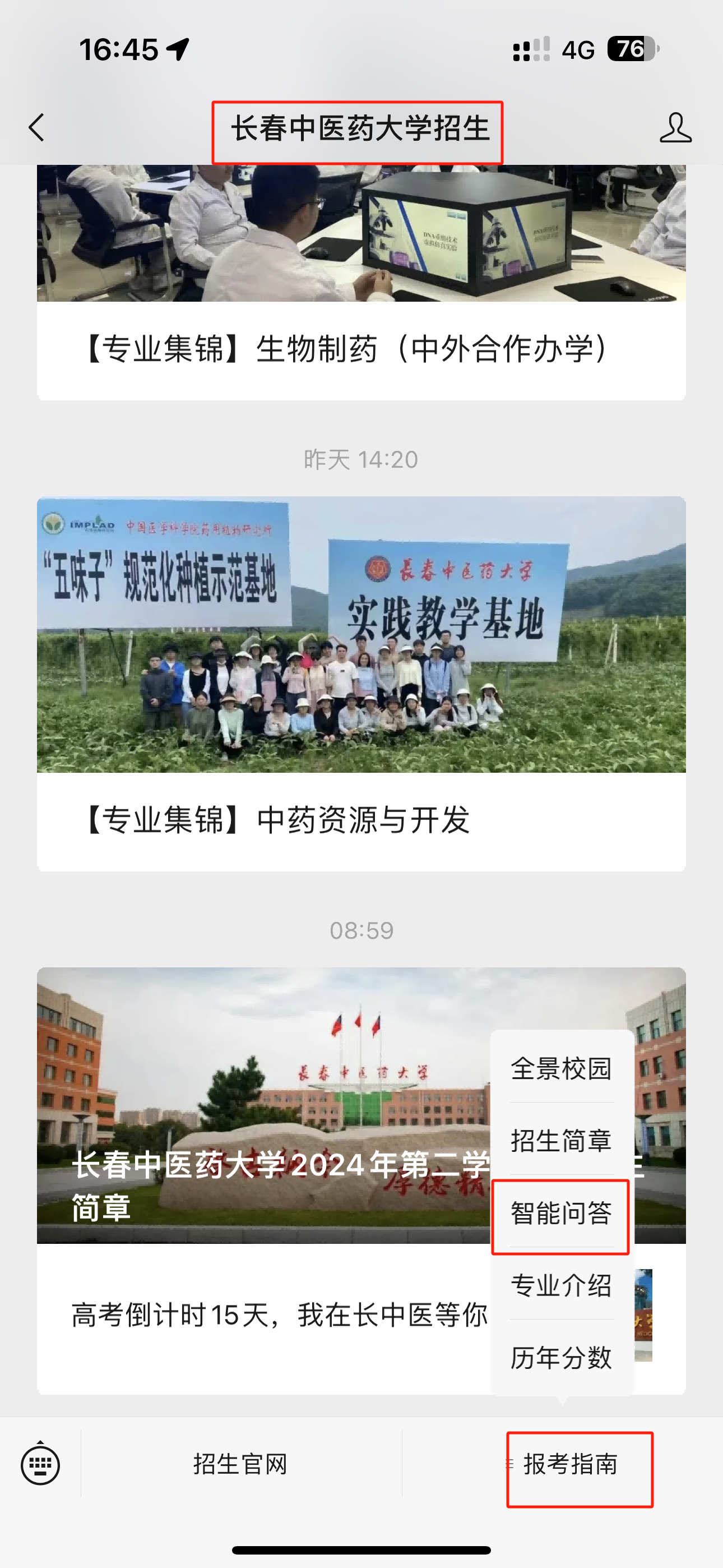 关注“长春中医药大学招生”微信公众号,点击报考指南中的“智能问答”进入在线答疑平台,查询报考常见问题,对于未解答的问题,可点击留言咨询以便老师及时回复。