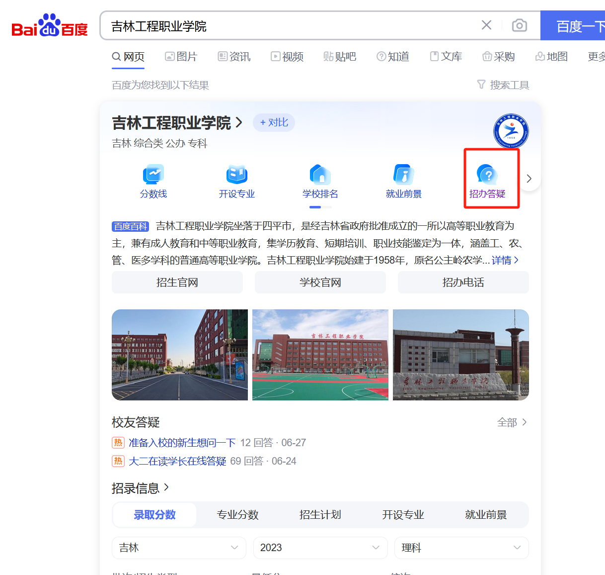 360搜索“吉林工程职业学院”,点击学校页卡的“问招办”模块,跳转至招生咨询平台,在问答页面点击查询报考常见问题,对于未解答的问题,可点击留言咨询以便老师及时回复。