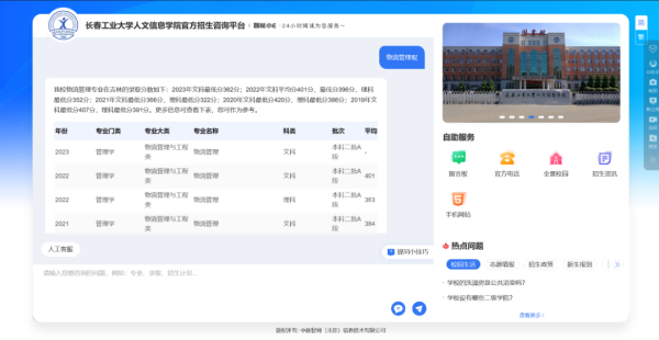 当你问“我是吉林省考生,选课物化生,分数在387分左右,能上工程造价吗?”时,系统不仅能通过DeepSeek大模型技术精准识别你的咨询意图是:省份、分数、选科要求、录取分数,还会结合历年录取数据,为你提供精准的回复!