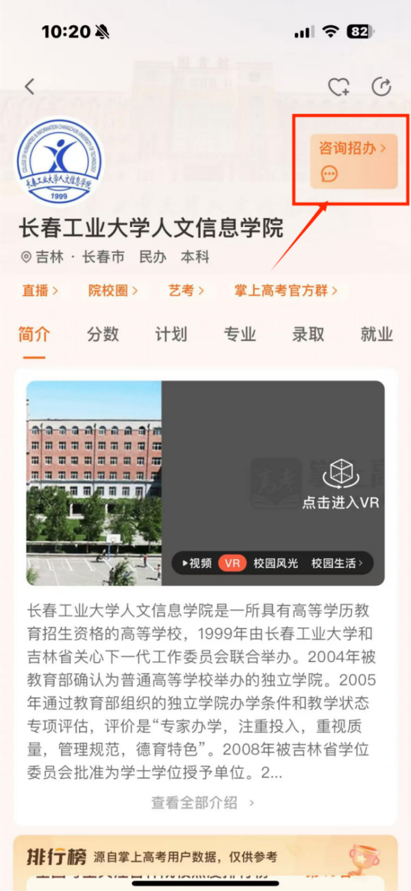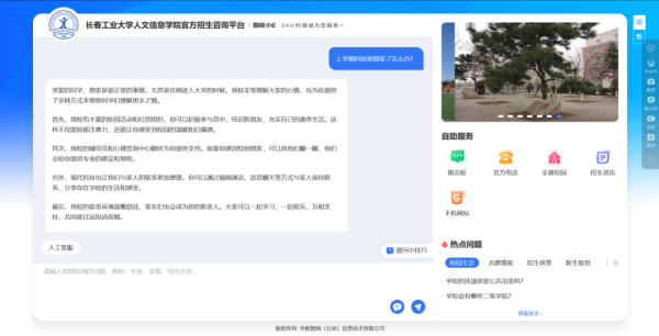 关注后可进入到“【长春工业大学人文信息学院招就处】”微信公众号主页,点击底栏【招生】菜单栏的“智能问答”即可在线咨询。移动端招生咨询平台问答页同时支持语音提问。