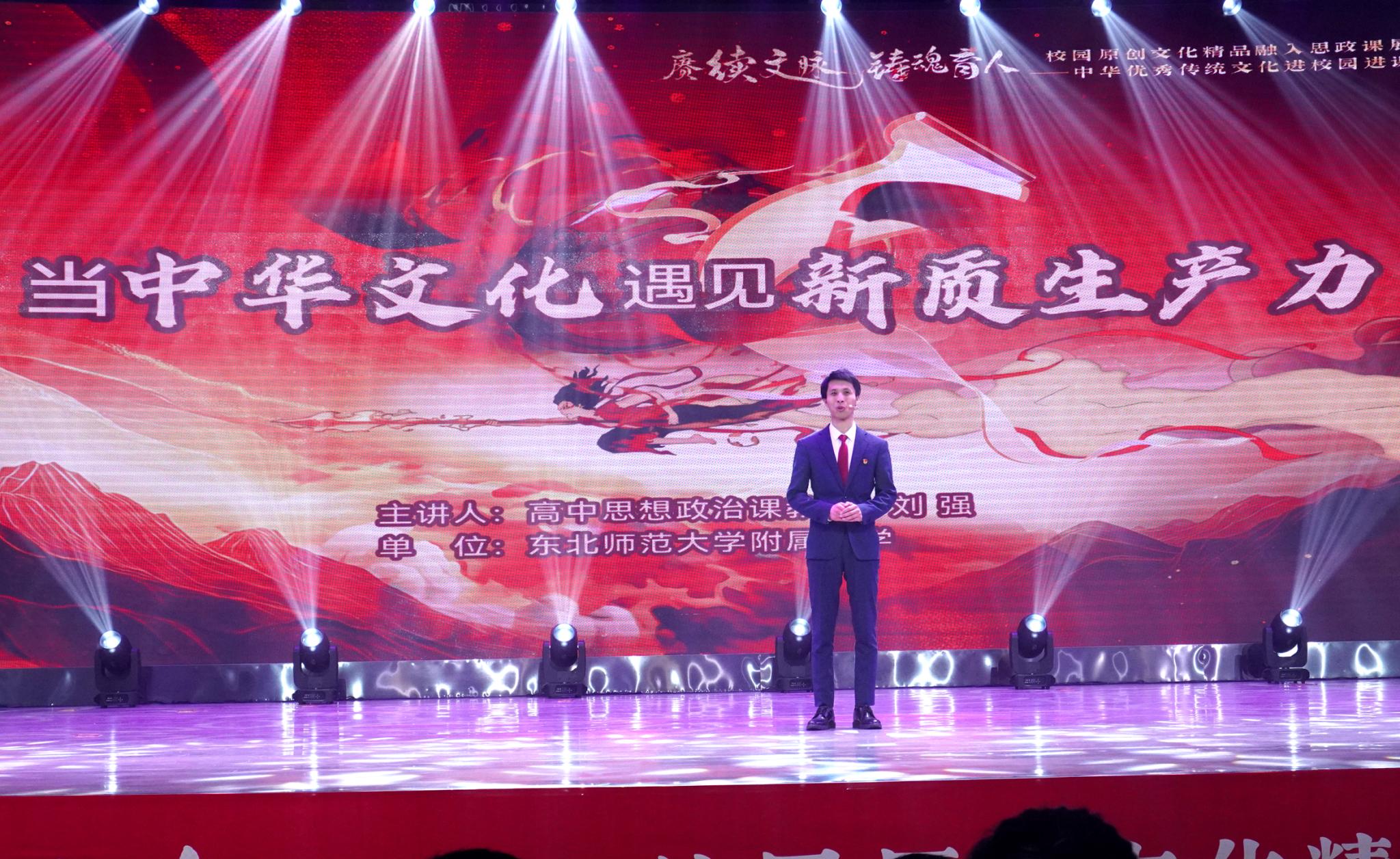 之后,吉林体育学院的学生带来了武术表演《哪吒之魔童闹海》,通过刚劲有力的武术动作,展现中华传统英雄人物形象,激发师生观众的民族自豪感。结合思政课堂,来自东北师范大学附属中学的思政课教师刘强,深入剖析了中华优秀传统文化与现代科技创新的交汇点,阐释了新质生产力如何在文化自信的引领下不断发展壮大。