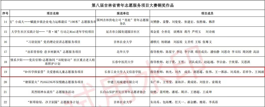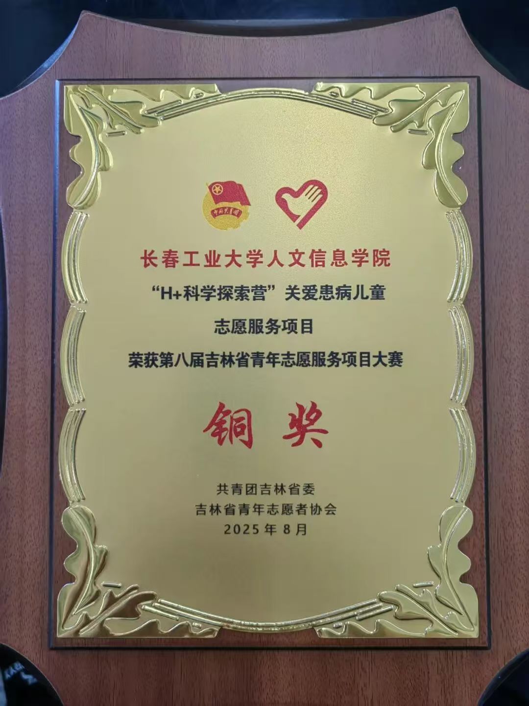 喜讯|长春工业大学人文信息学院电气与电子工程学院“H+科学探索营”关爱患病儿童志愿服务项目荣获第八届吉林省青年志愿服务项目大赛铜奖