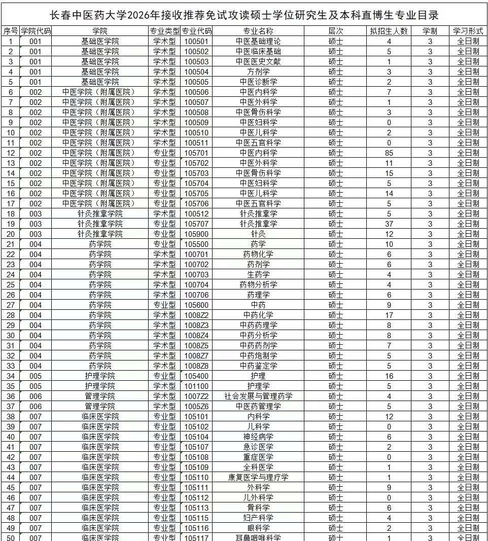 2026年,我校拟接收推荐免试攻读硕士学位研究生(以下简称推免生)453人,接收推荐免试直接攻读博士学位研究生(以下简称直博生)若干。具体专业及人数详见《长春中医药大学2026年接收推荐免试攻读硕士学位研究生及本科直博生专业目录》。
