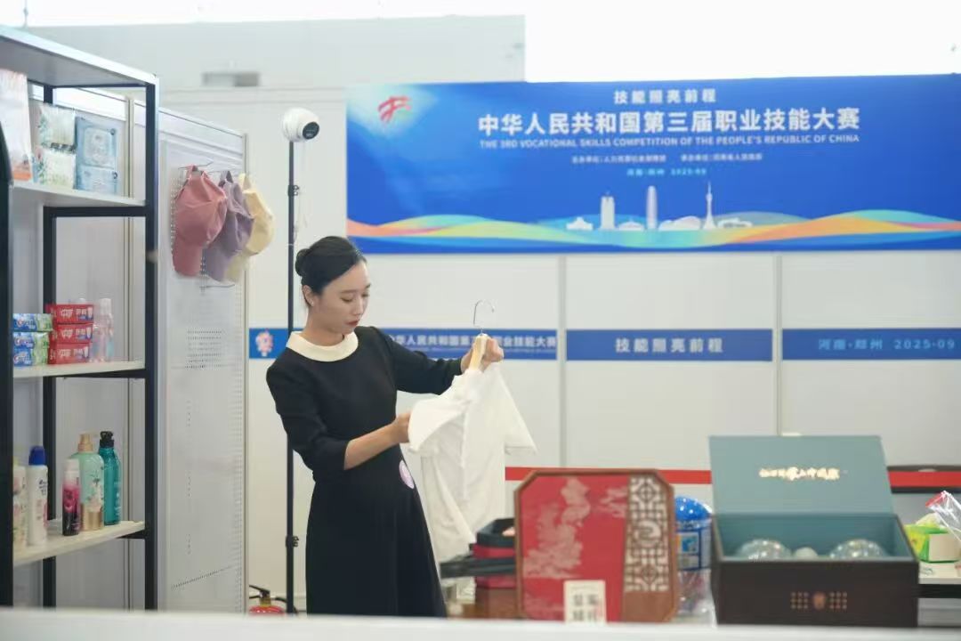 金牌背后,是日复一日的极致追求与千余小时的艰苦磨砺。清晨七点半,陈俪夫的身影已准时出现在实训室,用流利英语反复打磨销售话术。每天长达12小时的高强度训练,被精细分解为一个个“技能锻造”环节。“细节攻坚战”更是追求毫厘之差,商品陈列倾角、介绍手势幅度、英语语音语调,都在严格校准下不断优化。