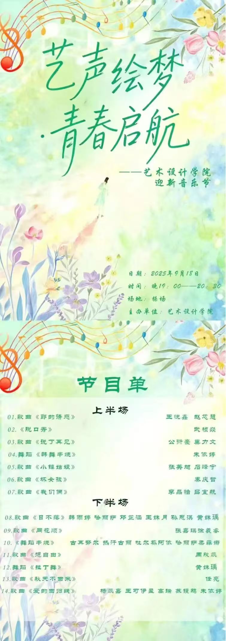 整场音乐节历时一个半小时,16个节目涵盖歌曲、舞蹈、脱口秀等多种艺术形式,充分展现了艺术设计学院学子在艺术领域的多元才华与创作活力。现场观众沉浸其中,掌声与欢呼声此起彼伏,新生们也在这场盛宴中感受到了学院的艺术底蕴与青春活力,为自己的大学生活开启了充满艺术气息的崭新篇章。