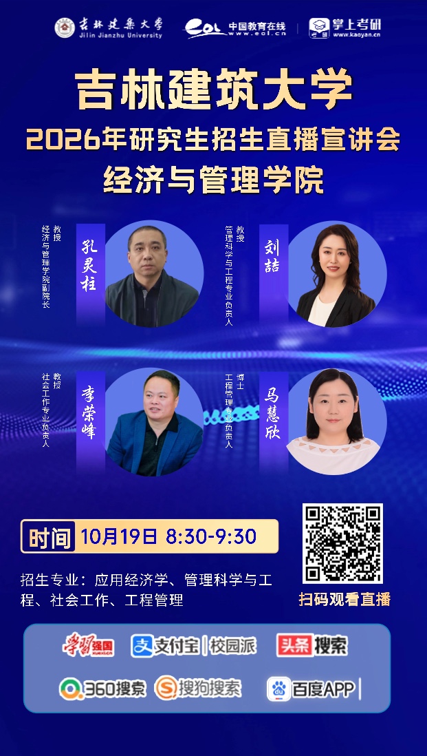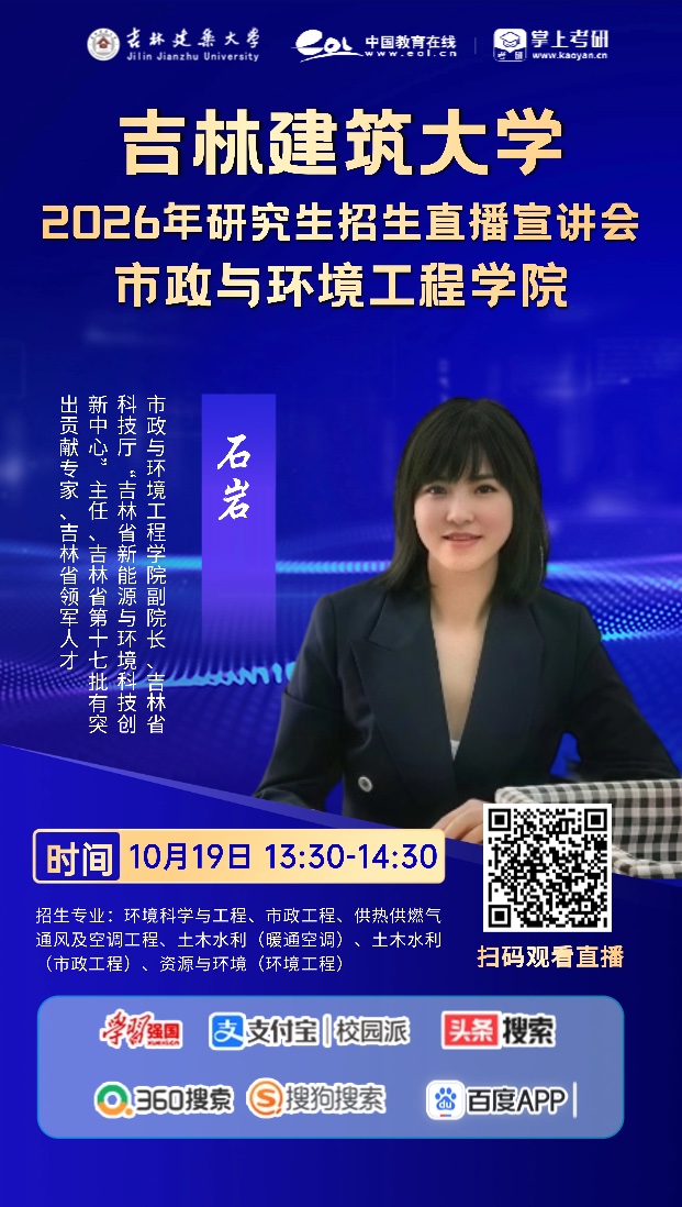 为解答广大考生的疑惑,精准服务考研学子,吉林建筑大学招生办公室将联合中国教育在线平台于近期隆重举办“2026年研究生招生直播宣讲会”。届时,各优势学科带头人及优秀导师代表将齐聚云端,这将是一场不容错过的线上盛会,为您揭开吉建研途的神秘面纱,助您开启人生新篇章!