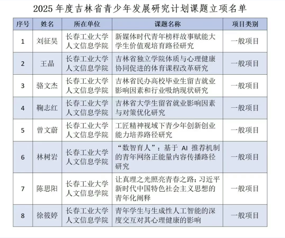 喜讯 | 长春工业大学人文信息学院8项课题获批2025年度吉林省青少年发展研究计划课题