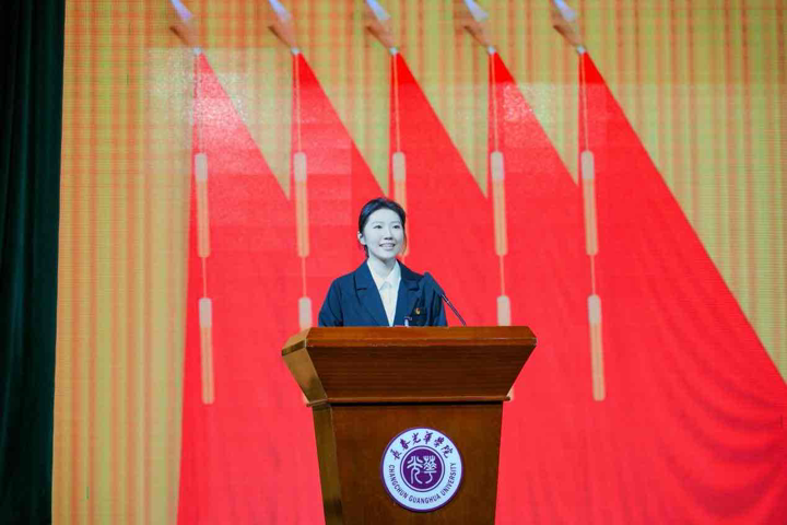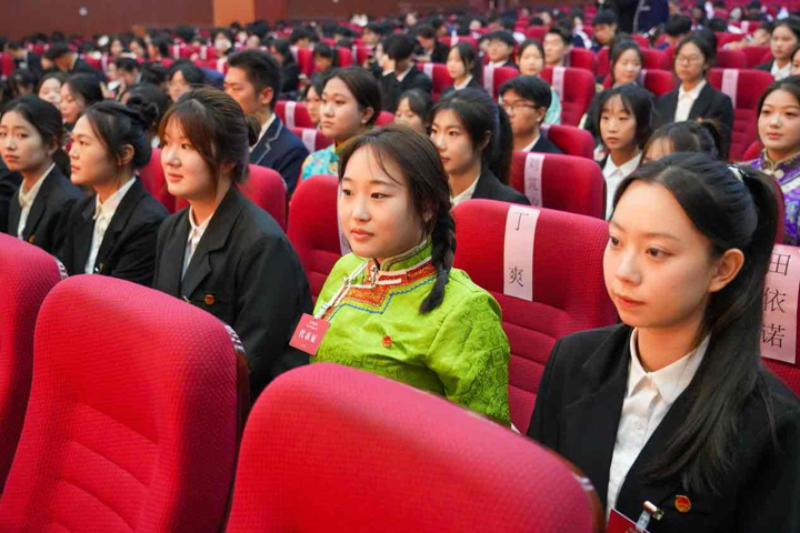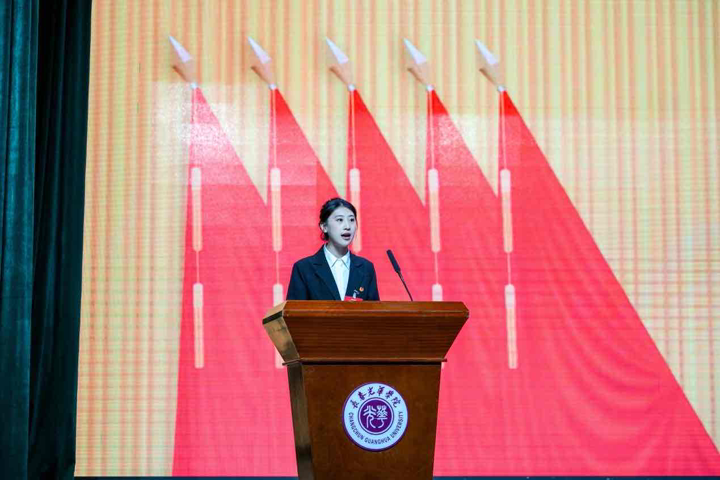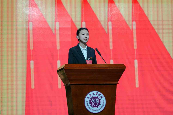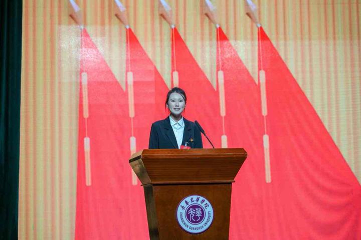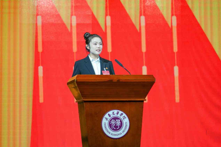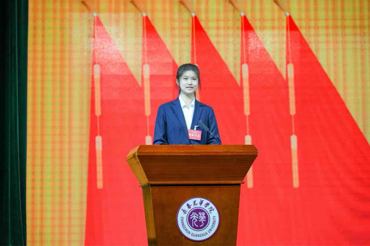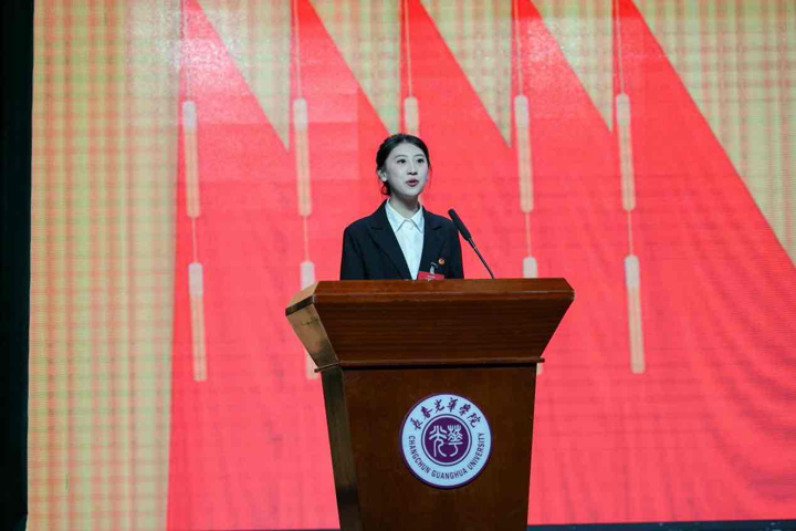 长春光华学院第二十五届学生会主席团成员尹嘉惠作表态发言,她表示,新一届主席团将恪守服务初心,勇担时代使命,在学校党委的领导和团委的指导下,聚焦主责主业,深化组织改革,切实发挥桥梁纽带作用,为把长春光华学院发展成为开放包容、有深厚文化底蕴的国际化大学贡献青春智慧和力量!