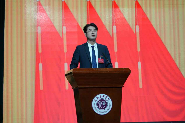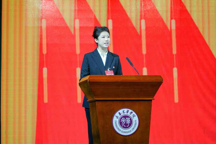 高海英代表学校向大会的召开表示祝贺,向全校同学致以诚挚问候。她表示,本次学代会适逢学校建校25周年、迎接教育部教育教学审核评估、编制“十五五”规划等重要时间节点,不仅是同学们行使民主权利的盛会,更承载着传承光华精神、共筑发展蓝图的重任。她希望同学们回望来路,初心如磐,感恩前行;立足当下,勇担使命,奋发有为;展望未来,志存高远,携手同行。希望同学们牢记习近平总书记对青年的殷殷嘱托,担当民族复兴大任,牢固树立共产主义远大理想和中国特色社会主义共同理想,将在纪念中国人民抗日战争暨世界反法西斯战争胜利80周年大会上对历史的敬畏转化为实践的动能,在光荣的接力赛中,跑出属于这一代人的最好成绩。