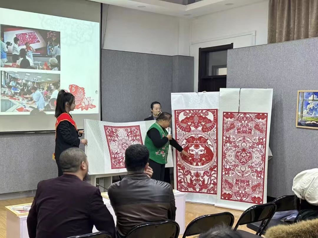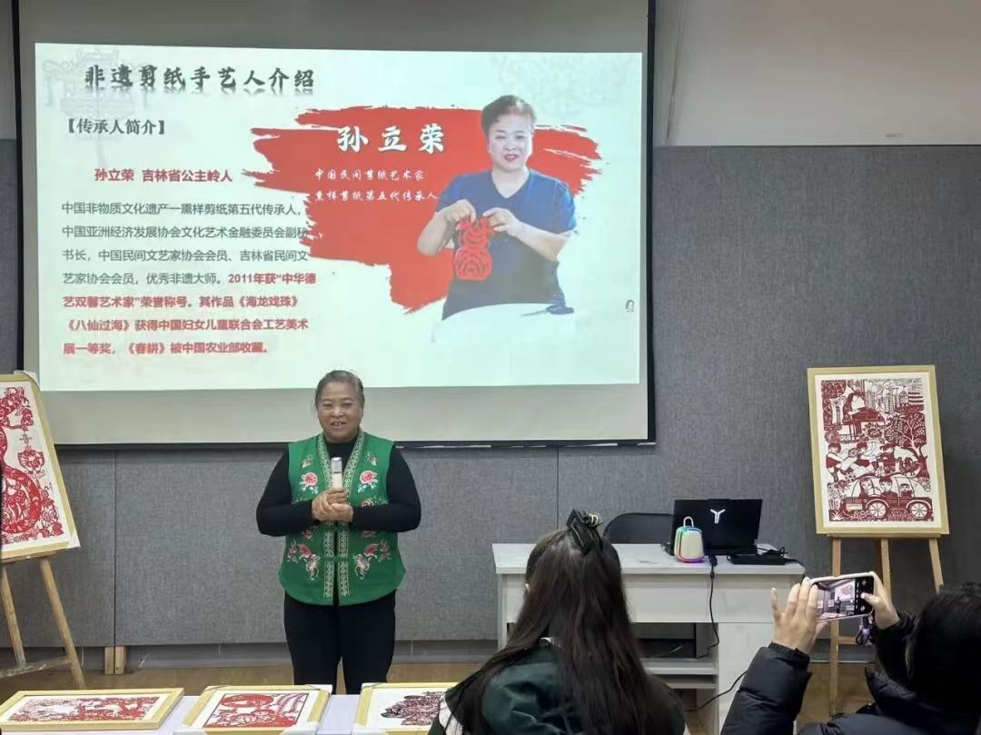 教学实践导师孙立荣以“熏样剪纸的历史与应用”为主题,为在场师生带来了一场精彩纷呈的讲座。她凭借丰富的专业知识和大量的实践积累,结合珍贵的史料图片与精美的实物作品,从熏样剪纸的起源娓娓道来,系统且清晰地梳理了这一非遗技艺在不同历史时期的发展脉络。
